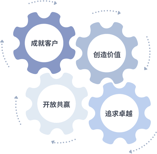 成就客户是一切决策的出发点,,创造价值是衡量所有工作的标准,,,,追求卓越是我们做事做人的态度,,,开放共赢是我们的格局也是最终的结果。。。价值观的齿轮环环相扣,,,推动着组织里的每个人不断向前。。。