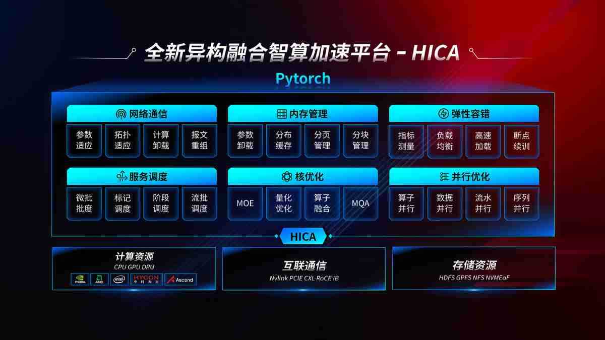 通过自研的服务层、、、、中间适配层、、、、以及调度编排算法,,采用数据并行、、、模型并行等多种并行方式,,,把并行计算任务进行有效的分解,,使其分别由相应的软件栈和算力资源来承接。。。当GPU资源变化,,,HICA可以实时动态调度计算子任务并调整模型拓扑和架构,,以充分聚合各种算力资源。。。